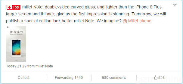 In other hands, a couple of days ago, according to the official Weibo account of Lin Bin – Xiaomi’s co-founder and president, he said that the company was planing to introduce new device of the Mi Note today. The tagline in the image is “Bamboo in the chest”, meaning confidence in Chinese.