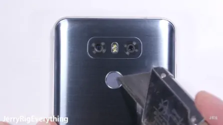 The tremendous test was conducted on Youtube channel JerryRig Everything. Any durability test is gonna be hurtful to the heart. They started the scratch one first, using the Mohs picks. Those with plastic screens like Galaxy S7 Active or NoPhone will scratch at level 3. LG G6 didn’t ‘t scratch until level 6 since its screen was protected with Gorilla Glass 3. Move to the LG logo at the bottom and the 5MP front camera on top. They cannot be scratched off for lying under the same Gorilla glass.