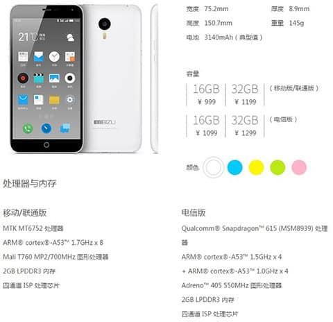 Except for this huge changes, the rest of specs are still same with the first release Meizu m1 Note. It means that its phone will be packed 5.5″ screen, a resolution of 1080p along with a pixel density of 403ppi and a 75% reduction in reflection thank to a full GFF lamination. The phone uses with a Mali-T760 GPU and 2GB of RAM. Besides that, the Meizu m1 note measures 75.2 x 150.7 x 8.9mm and weighs 145 grams with a super battery of 3,140mAh. As for camera, there’s a 13MP main camera made by Samsung and shoots 1080p videos. In the opposite side, a 5MP “selfie” camera takes up the front with a 4-element lens.
