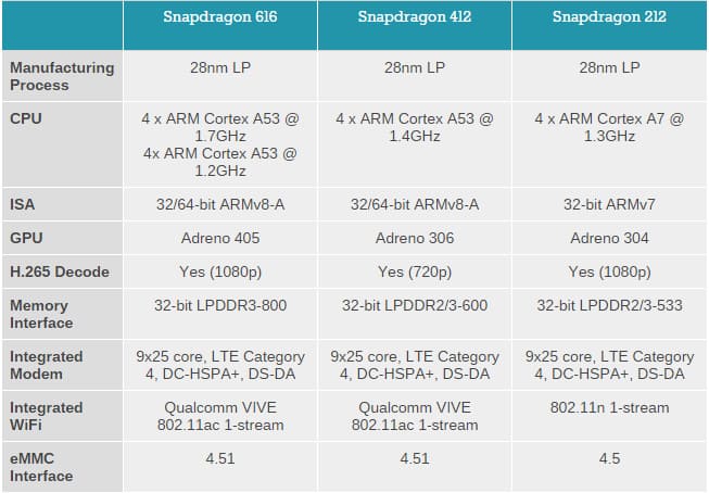 Snapdragon 212 and 412 will provide power for the more affordable series, while Snapdragon 616 will be on more mid end series. The three chipsets are produced with 24nm technology.