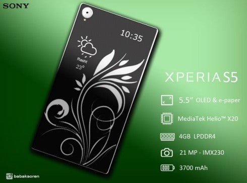 In terms of Sony Xperia S5 specs, the handset is said to have a 5.5-inch OLED screen (but the resolution is not mentioned) and an e-paper one (which can help save a lot of power), which means that S5 owns a dual display like YotaPhone. The whole machine is powered by a MediaTek Helio X20 processor (instead of Snapdragon 810 chip used in the real Sony Xperia Z5 perhaps to avoid the heating issue) and 4 GB of RAM.