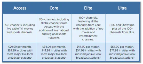 Besides PS4 and Android TV just recently, Vue is also available on PS3, Roku, and iOS and Android mobile devices. One account can use up to five devices to stream at the same time. The most basic plan, Access, will have 55+ channels for $30. Upgrade to Core for $5 more, at $35, you will get 70+ channels. At $45, the Elite plan gives you 100+ channels. The highest plan, Ultra, will include HBO and Showtime, plus all channels from Elite, for $65. You can choose the package that fits your needs the most!